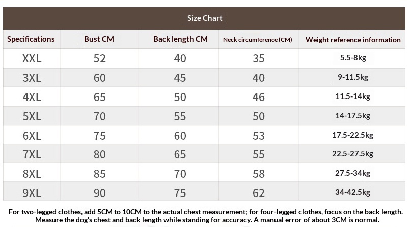 Size: 3XL bust 60cm recommended 18-23kg, 4XL bust 65cm recommended 24-28kg, 5XL bust 70cm recommended 29-35kg, 6XL bust 75cm recommended 36-45kg, 7XL bust 80cm recommended 46-55kg, 8XL bust 85cm recommended 56-66kg, 9XL bust 90cm recommended 67-75kg