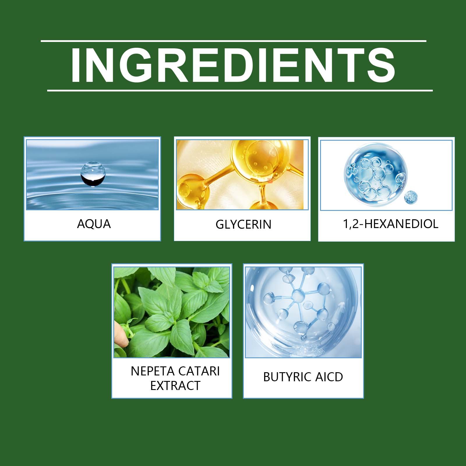 Ingredients: water glycerin, 1,2- hexanediol, extract of NEPETA CATARIA, butyric acid
